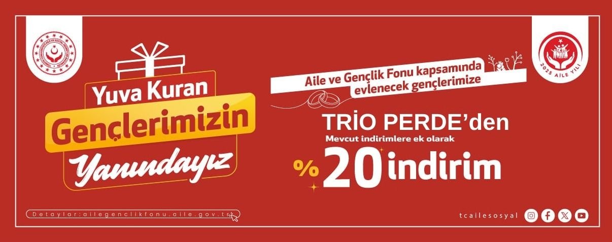 TrioPerde olarak, T.C. Aile ve Sosyal Hizmetler Bakanlığı tarafından yürütülen Aile ve Gençlik Fonu – Evlenecek Gençlerin Desteklenmesi Projesi kapsamında, “Yuva kuran gençlerimizin yanındayız” mottosuyla evlenecek genç çiftlerimize özel bir indirim kampanyası sunuyoruz.